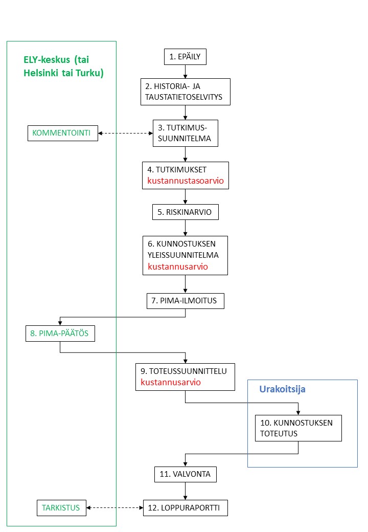 - Pima-päätöksen tekee ELY-keskus, Helsingin ja Turun kaupungin ympäristönsuojeluviranomainen. Päätöksessä annetaan yleensä yleissuunnitelmaan täsmentäviä määräyksiä. Jos päätöksen ja kunnostuksen yleissuunnitelman välillä on ristiriitoja, noudatetaan päätöstä.
